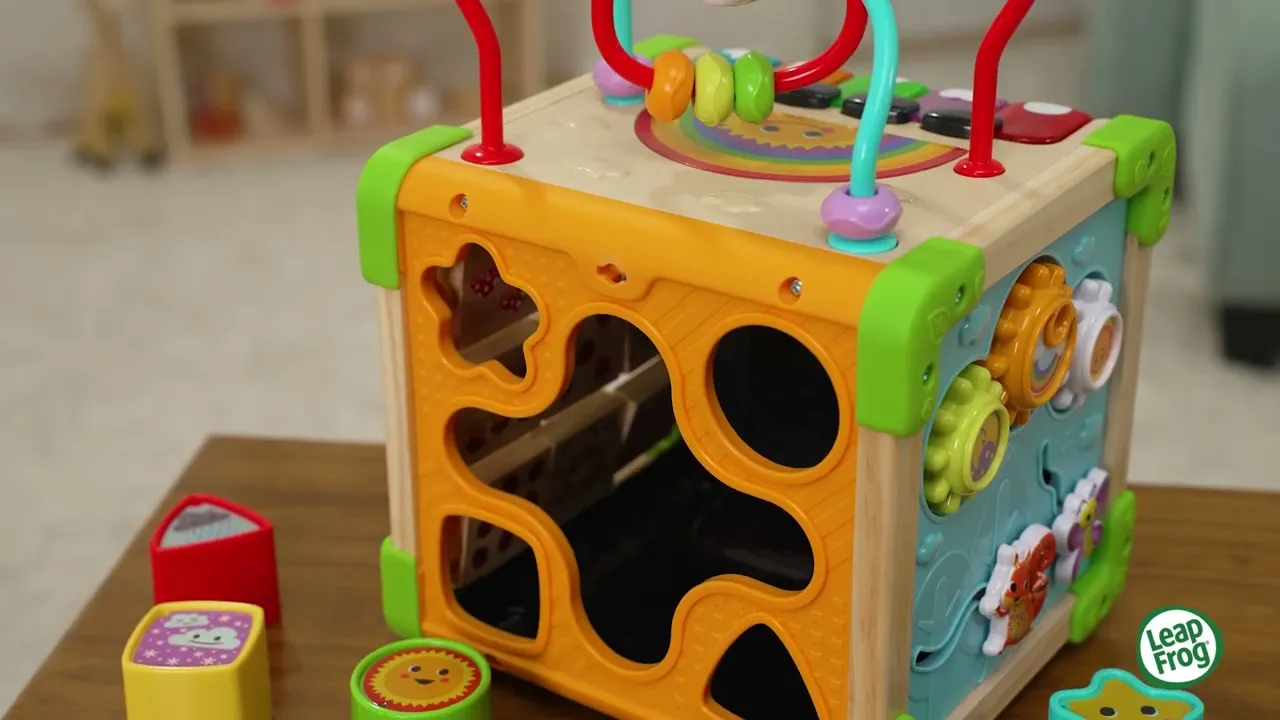 Это вечеринка с блоками с деревянным кубом Touch & Learn™! Захватывающие занятия на каждом углу знакомят малышей с формами, цветами, числами, животными и музыкой.
